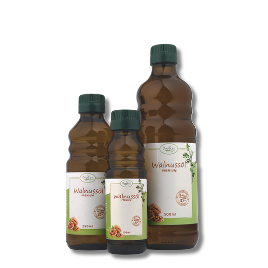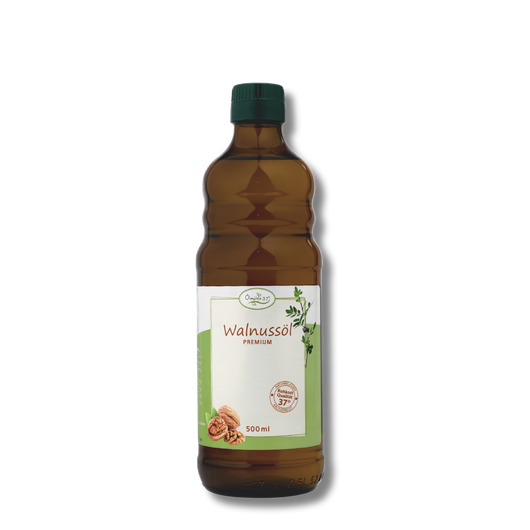 Walnussöl gilt als außerordentlich aromatisch und ist nicht zuletzt deswegen weltweit sehr beliebt. Wer sich genauer mit den Nährstoffen von Walnussöl auseinandersetzt, entdeckt jedoch auch schnell die Vorzüge, die das hochwertige Speiseöl auf uns Menschen haben kann. Walnussöl wird aus den ölhaltigen Nüssen hergestellt, die wir vor allem als Snack in der Winterzeit kennen. Bei der Herstellung unseres Walnussöls in Rohkost Qualität setzen wir natürlich wie bei allen Speiseölen aus unserem Sortiment auf die schonende Kaltpressung, bei der die wichtigen Inhaltsstoffe aus der Walnuss erhalten bleiben und auch im Walnussöl ihre volle Kraft entfalten. Dafür verbinden wir eine konstante Wasserkühlung der Maschinen mit einem einzigen, langsamen Pressvorgang, sodass auch Eigenhitze bei der Herstellung des Walnussöls verhindert werden kann. Die von uns verwendeten Walnüsse stammen ausnahmslos aus sehr gutem Anbau und begeistern mit einer besonders hochwertigen Qualität. Dank des intensiven und nussigen Geschmacks ist kaltgepresstes Walnussöl in der Küche die perfekte Unterstützung bei würzigen Speisen. Insbesondere in der französischen Küche spielt Walnussöl eine essentielle Rolle. Entdecken Sie selbst den wunderbaren und intensiven Geschmack von kaltgepresstem Walnussöl – mit Speiseöl in Rohkost Qualität von Ölmühle37!